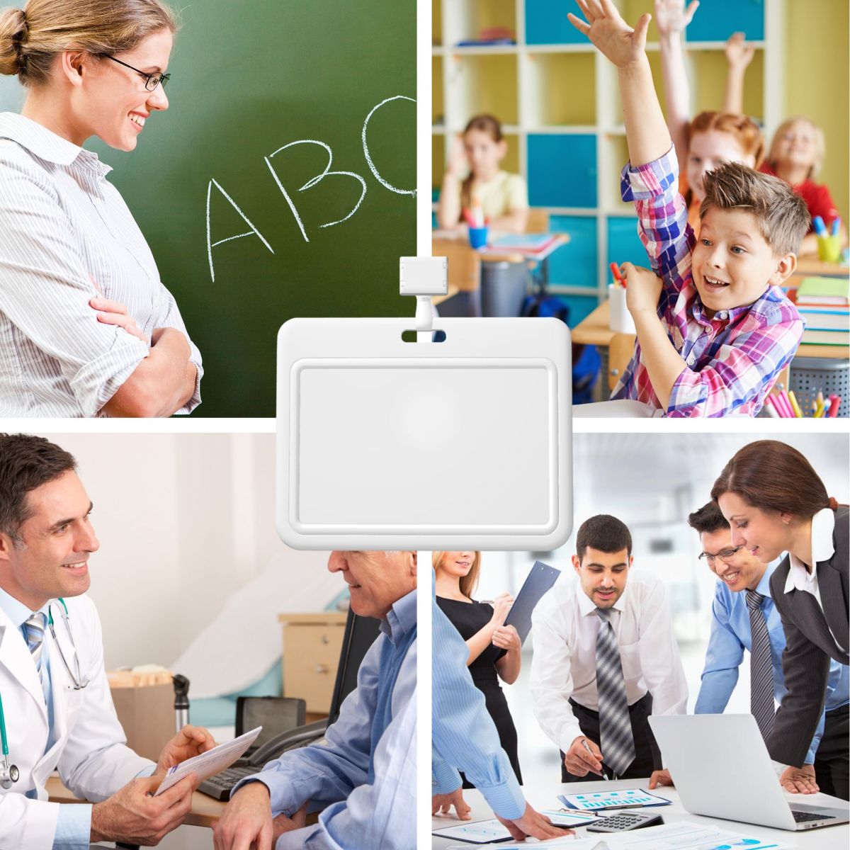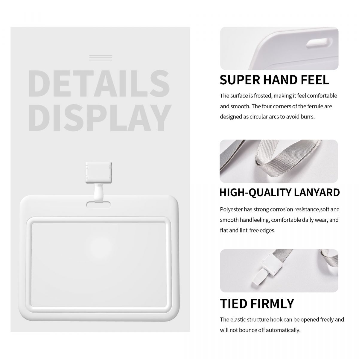 产品性能:经久耐用的abs材质,具有耐磨、耐腐蚀性。双面滑盖设计,美观,坚固,轻巧。可扫描透明膜,防水防污,无需在每次使用ID卡时划开工牌盖。顶部中间空槽用于挂绳索,长而柔软的挂绳佩戴舒适, 挂绳和工牌之间的连接也非常牢固,易于拆卸和重新安装。这款带挂绳工牌适合多种场合,其紧凑的尺寸和功能使其成为工作商务活动中的理想之选。