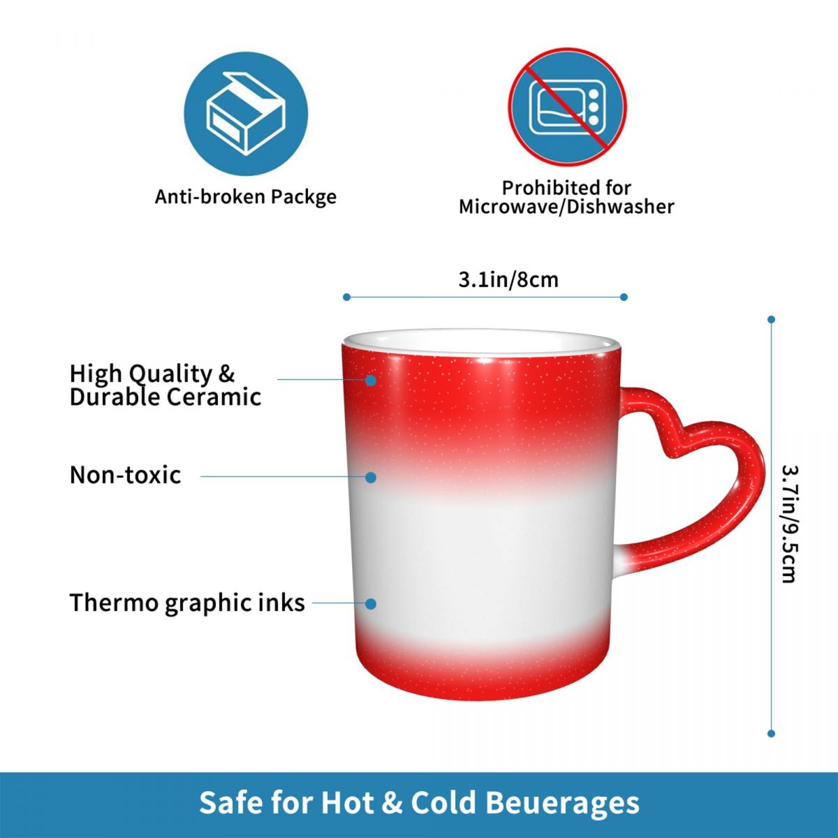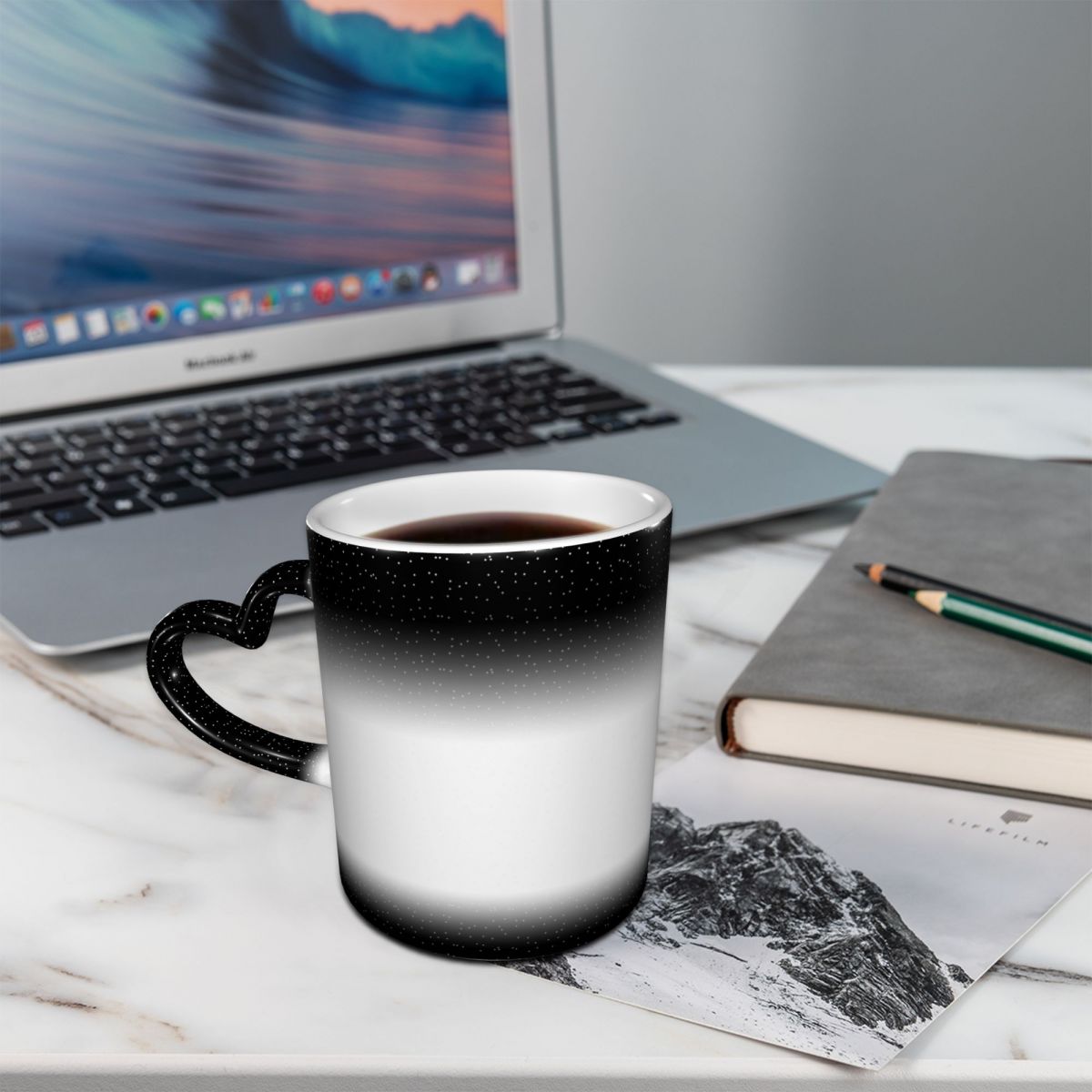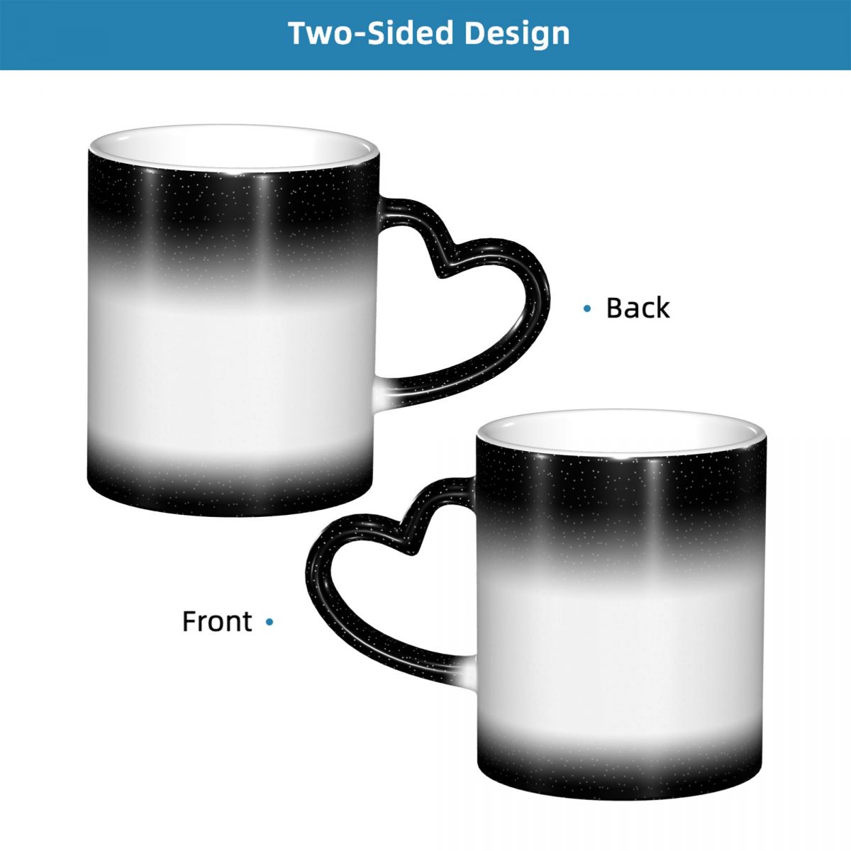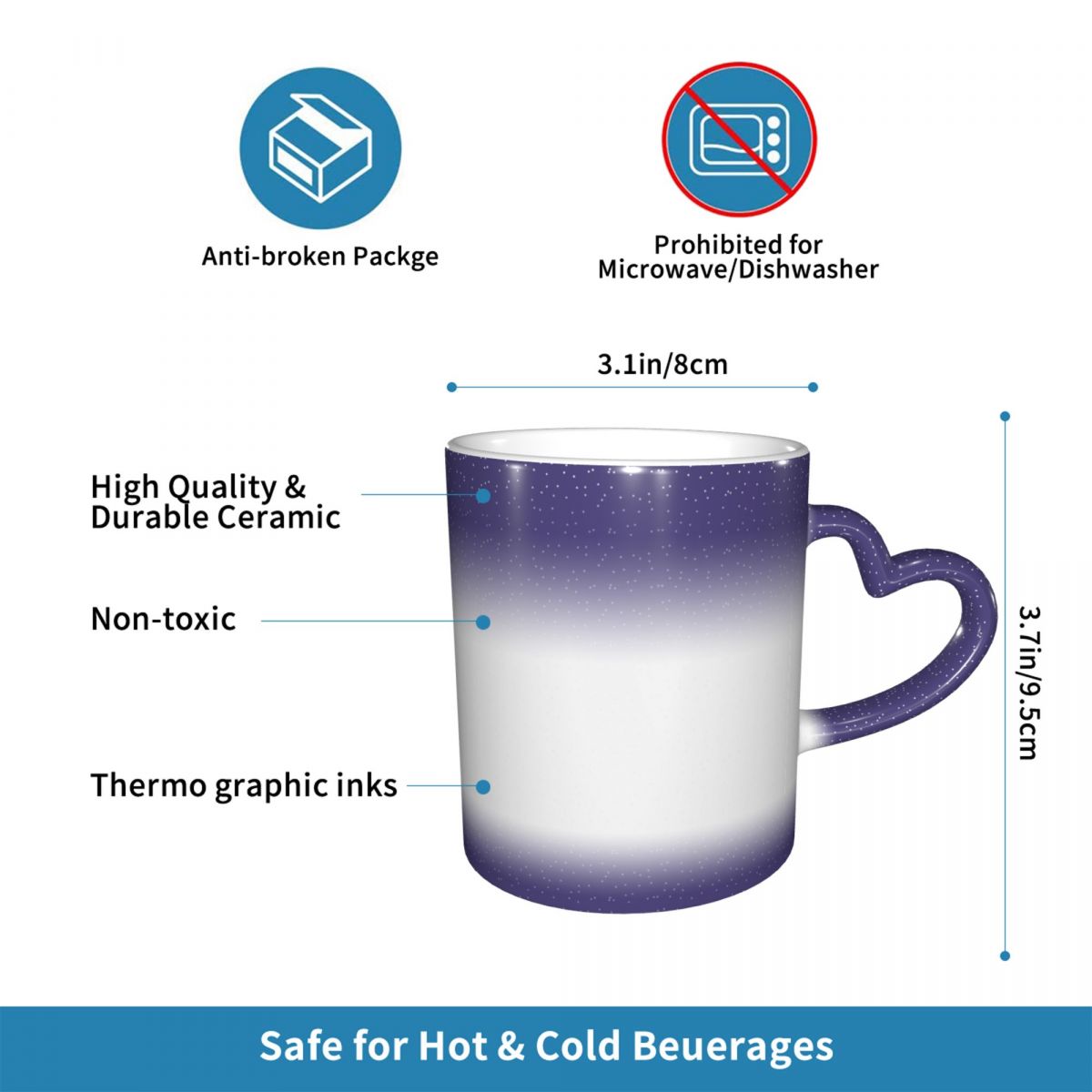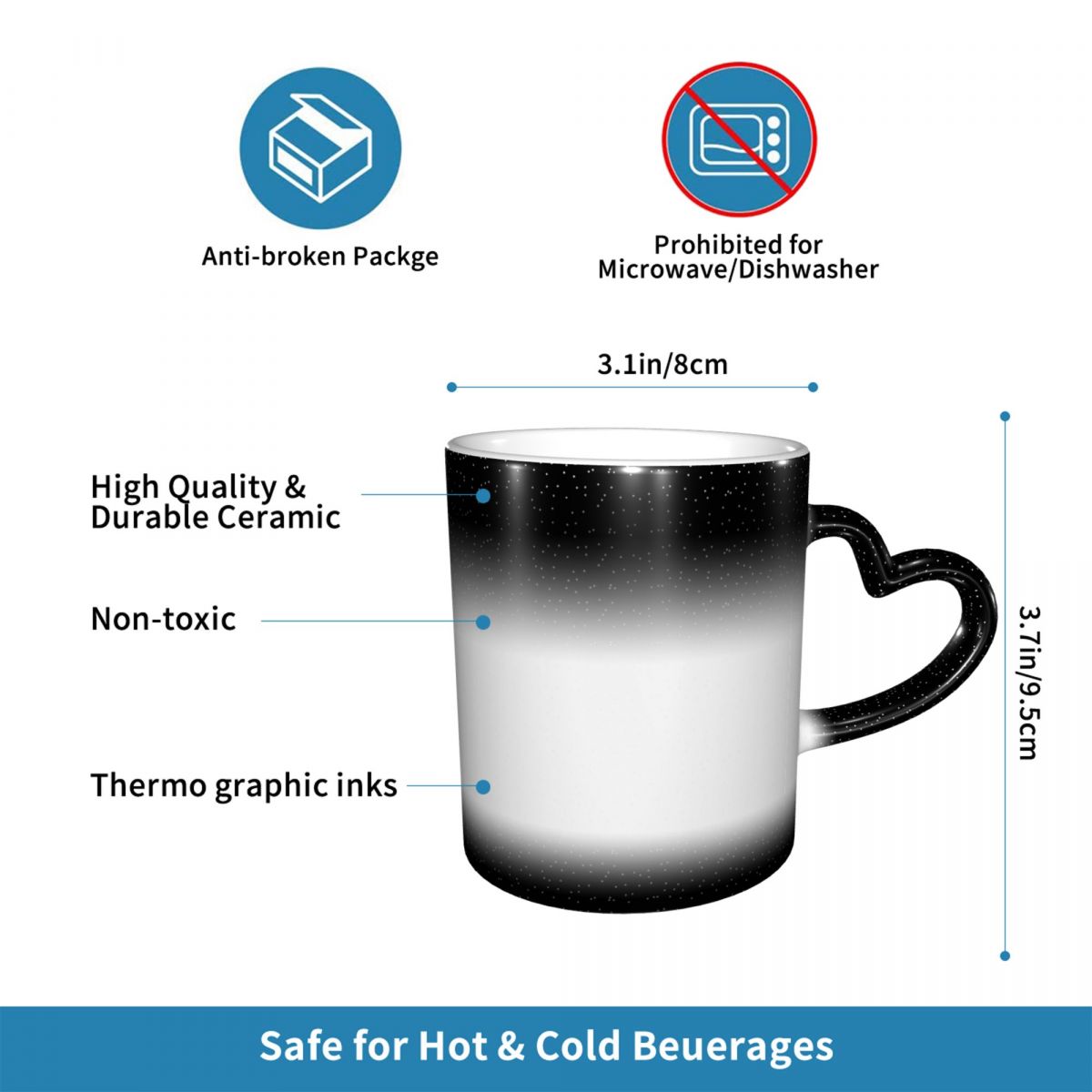 产品性能:冷杯呈黑色,倒入热液后会变成白色,出现打印图像,温度降下时又变回黑色。人性化设计、安全、放心使用,美观实用,环保材质。杯底加厚防滑设计。使用方便,便于存放,取用自如。杯身厚实,简约大方,健康无味,杯口细腻光滑,让你的口感更加回味无穷,独特的耳朵设计手握着舒适,陶瓷杯重量适中,坚固耐用,给您和您的家人带来更健康的生活。