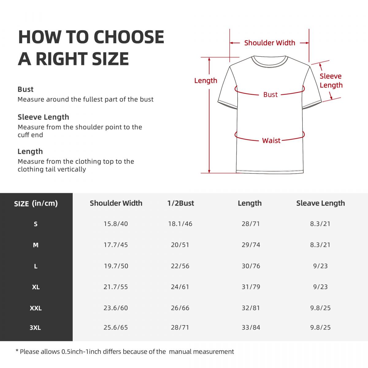 特别说明:此尺码数据在衣服平铺下测量所得,因测量方法不同,误差在2-4cm内的属于正常现象