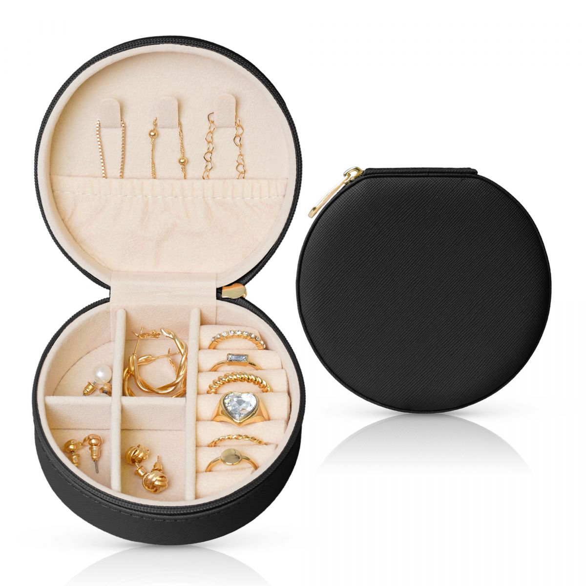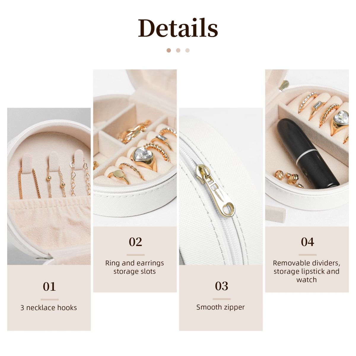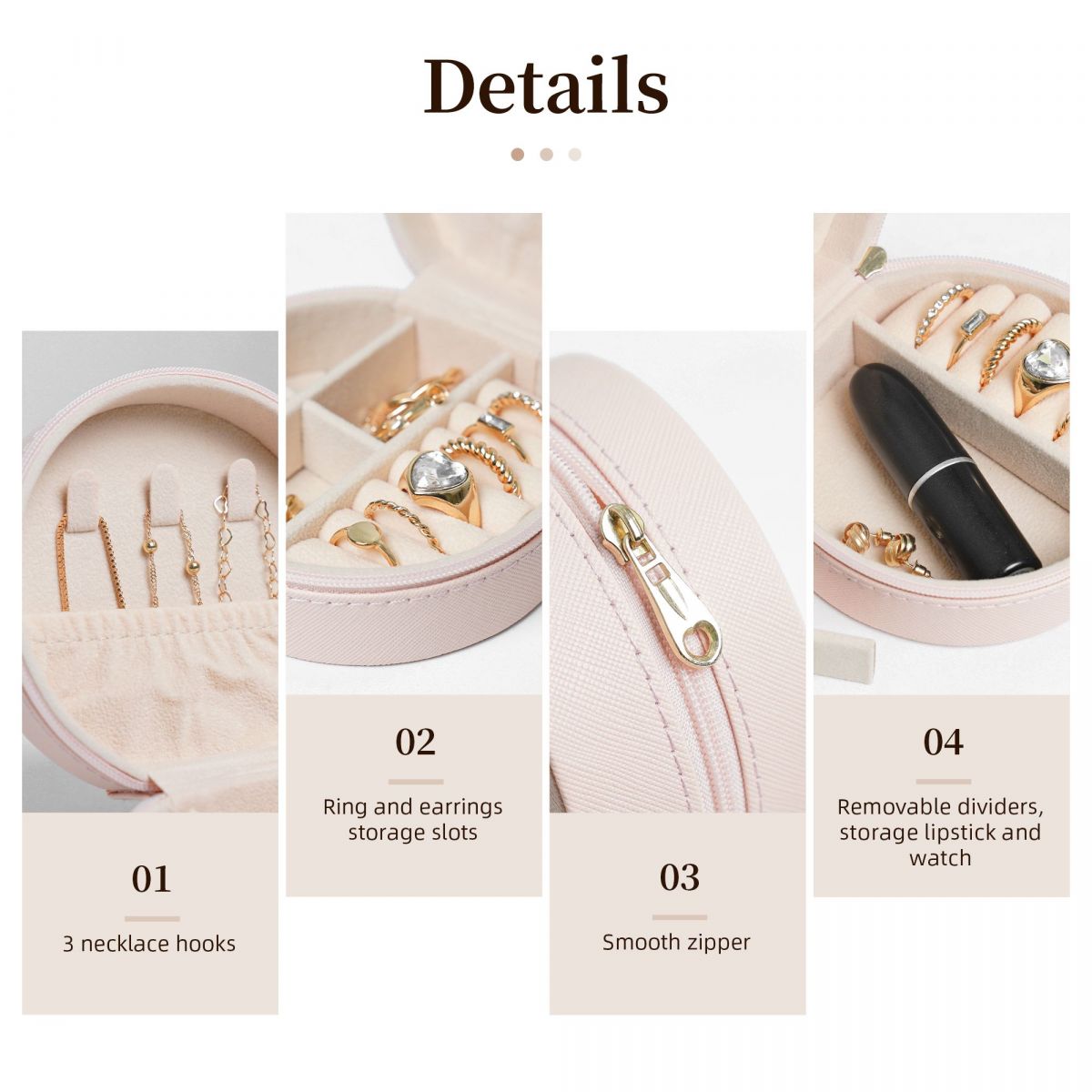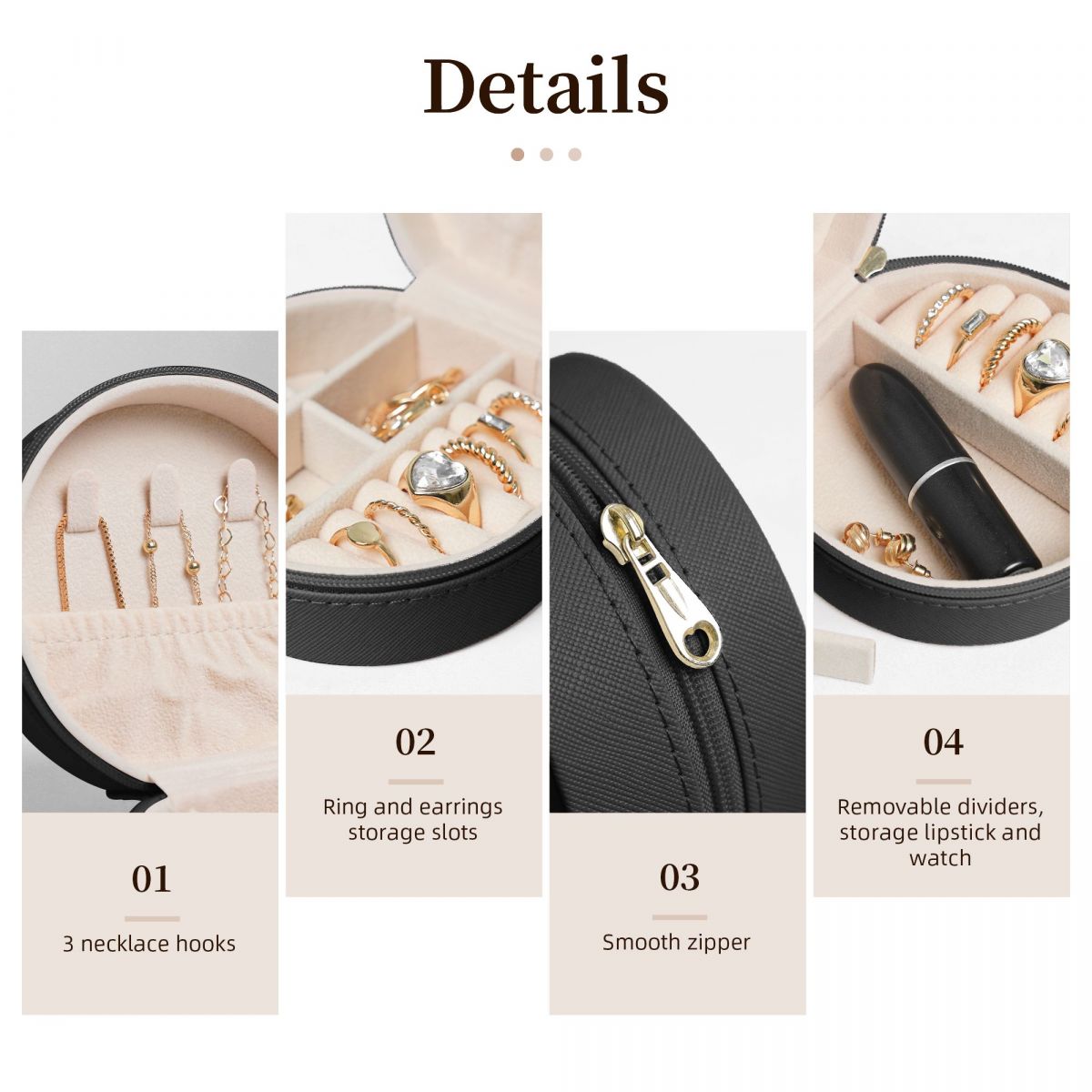 产品性能:首饰盒精选PVC皮革,天鹅绒衬里,耐磨,耐用,防水。外面是用光滑的拉链密封的。小巧轻便的便携首饰盒,可以轻松放在您的手提包或行李中。虽然首饰盒的体积很小,但是容量大,内部隔层设计在保持大容量的同时节省了空间。你可以同时存放项链、耳环、手镯和其他珠宝,而不会占用太多空间。
