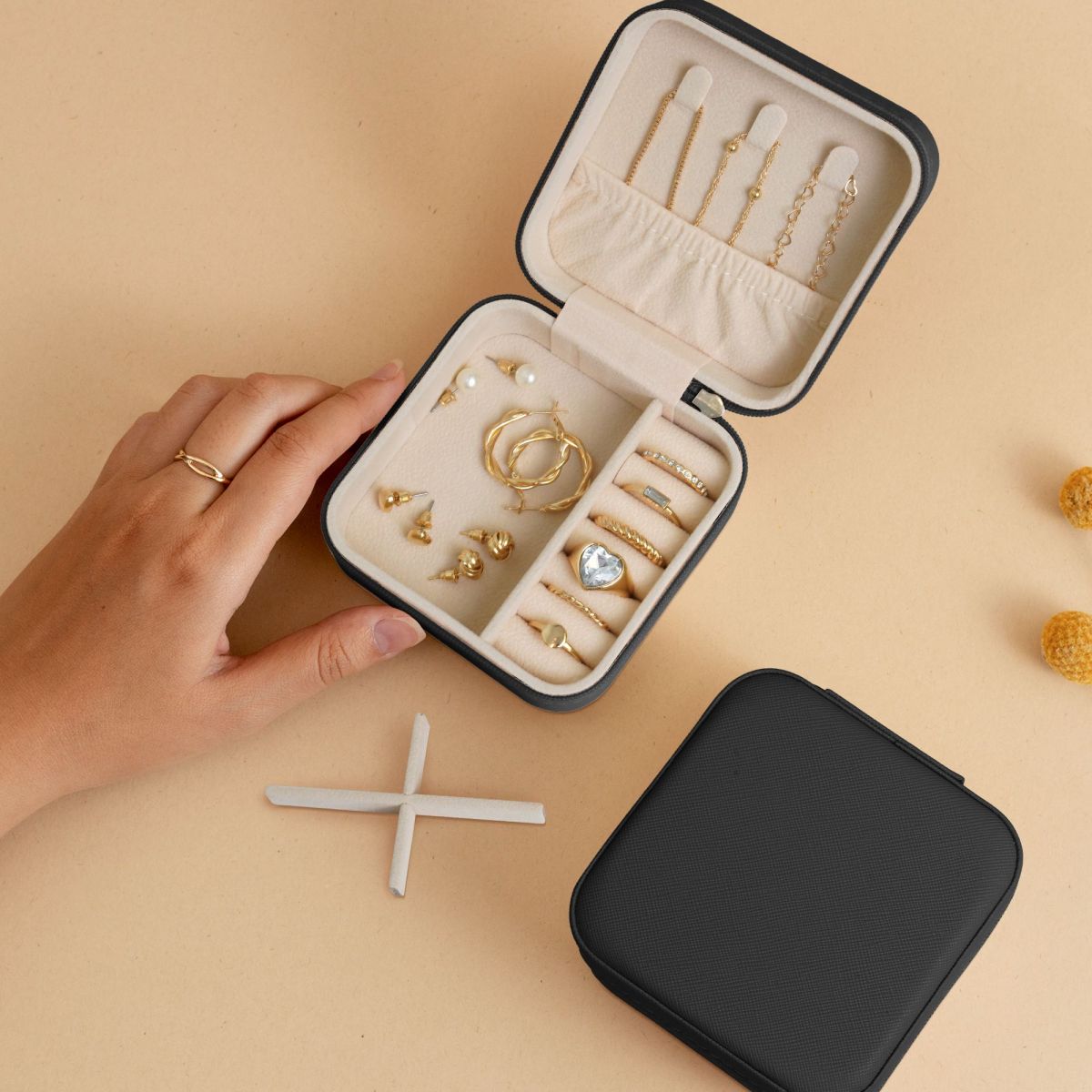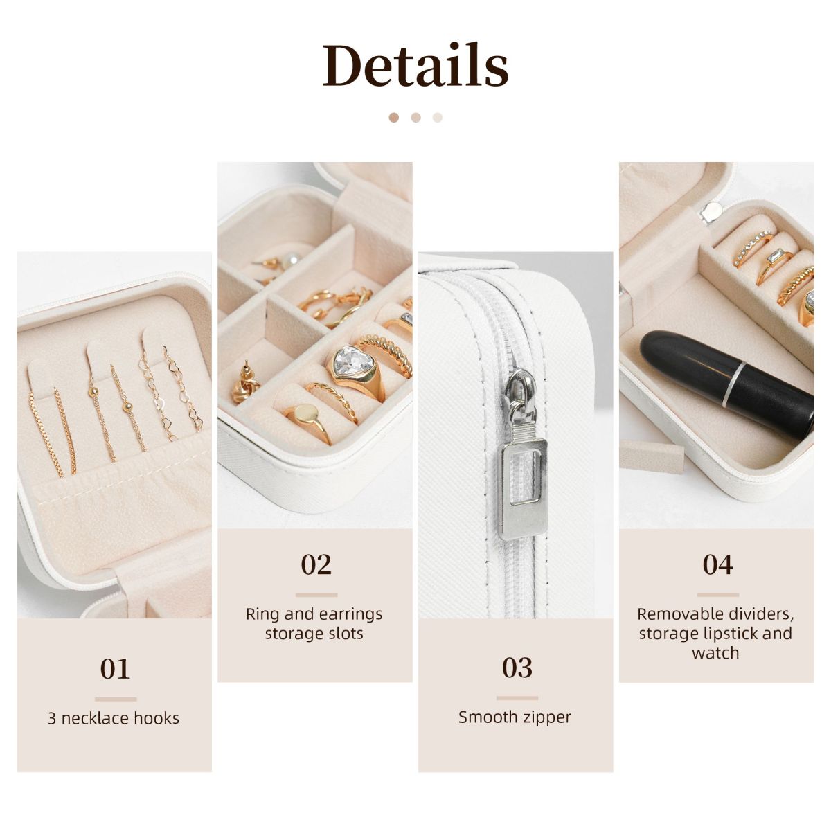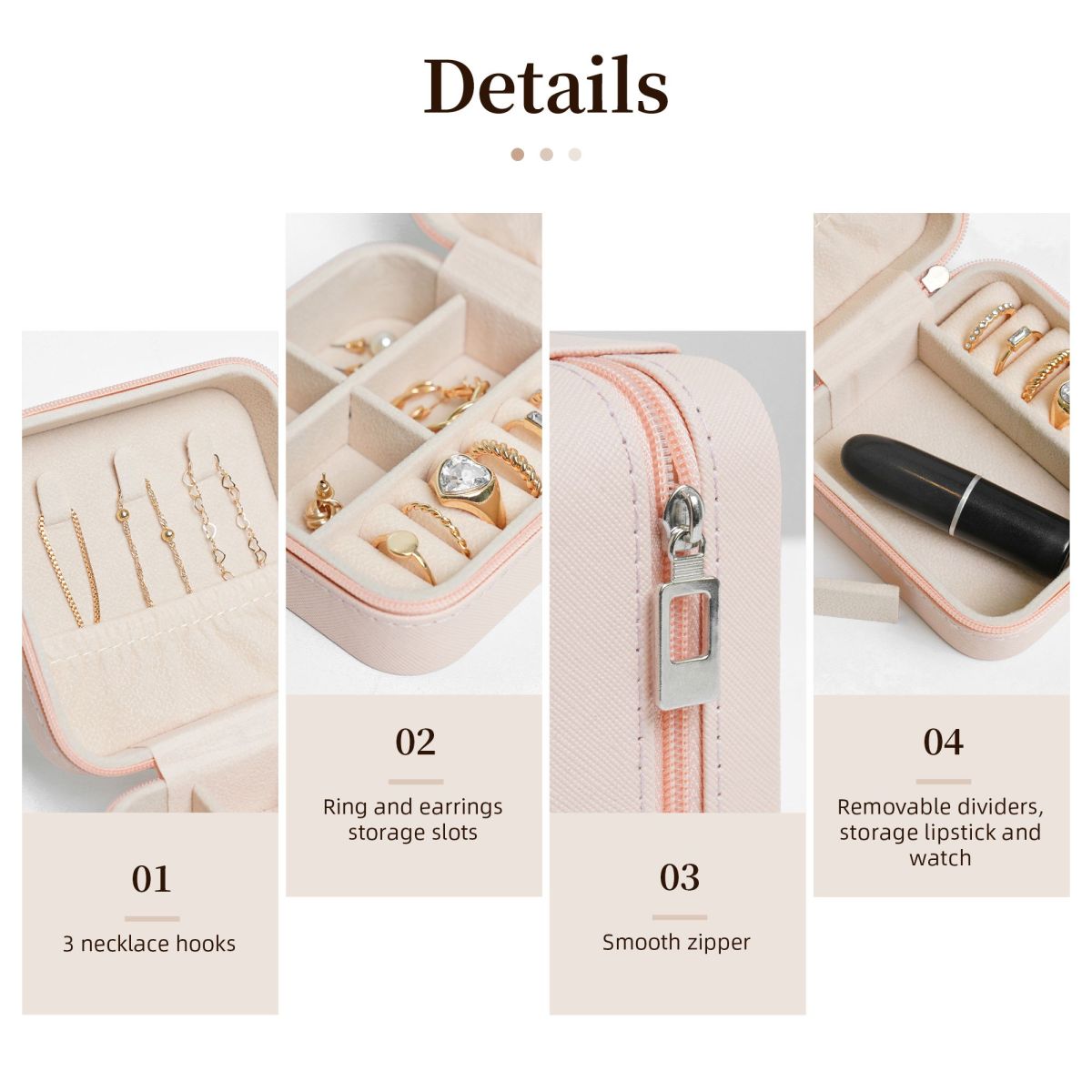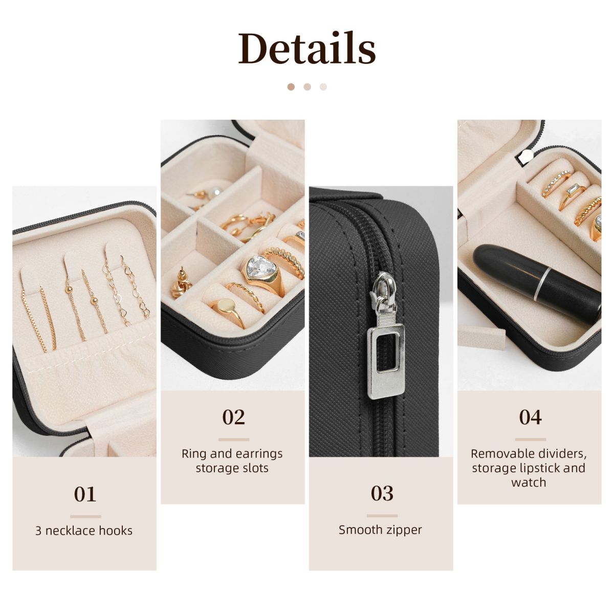 产品性能:首饰盒精选PVC皮革,天鹅绒衬里,耐磨,耐用,防水。外面是用光滑的拉链密封的。小巧轻便的便携首饰盒,可以轻松放在您的手提包或行李中。虽然首饰盒的体积很小,但是容量大,内部隔层设计在保持大容量的同时节省了空间。你可以同时存放项链、耳环、手镯和其他珠宝,而不会占用太多空间。