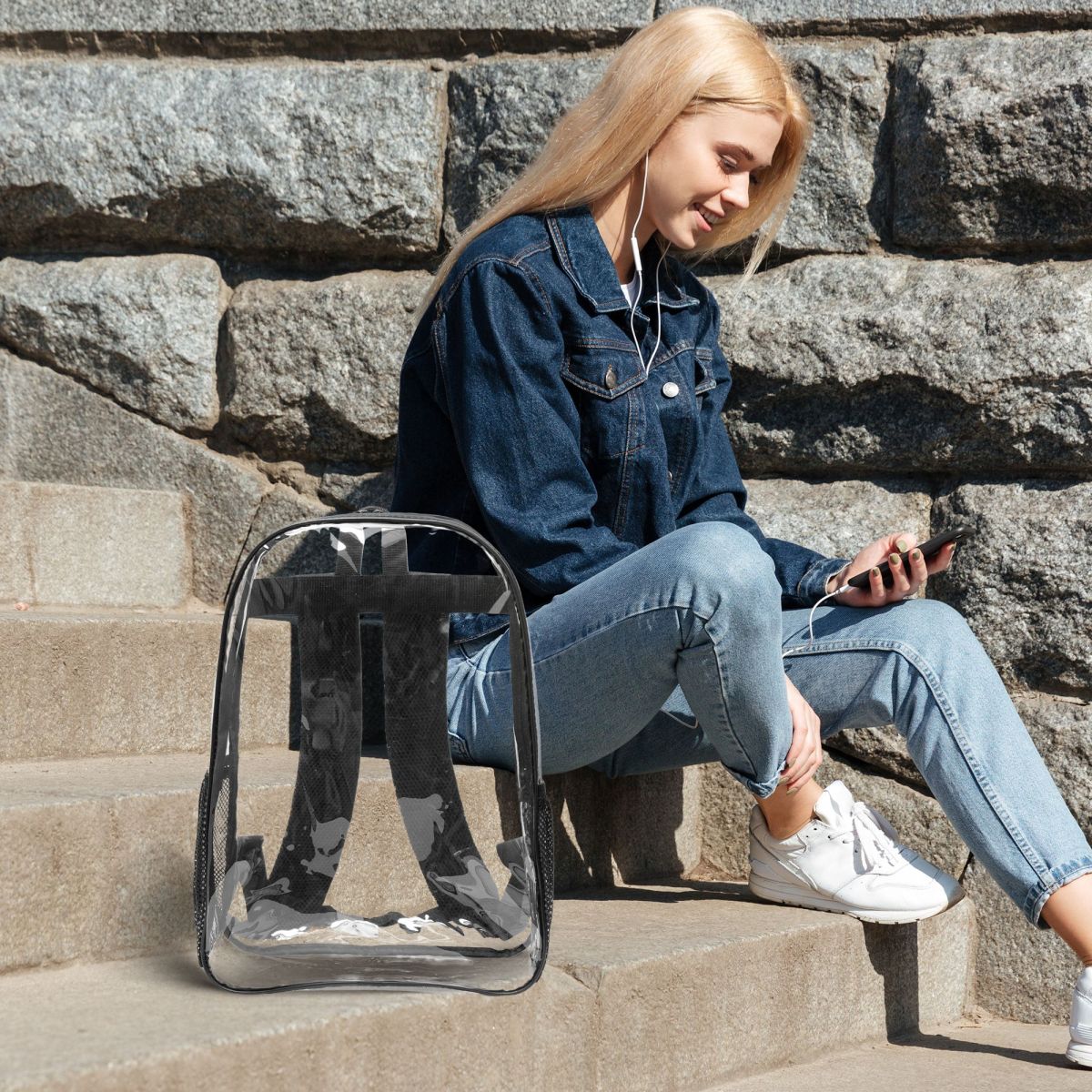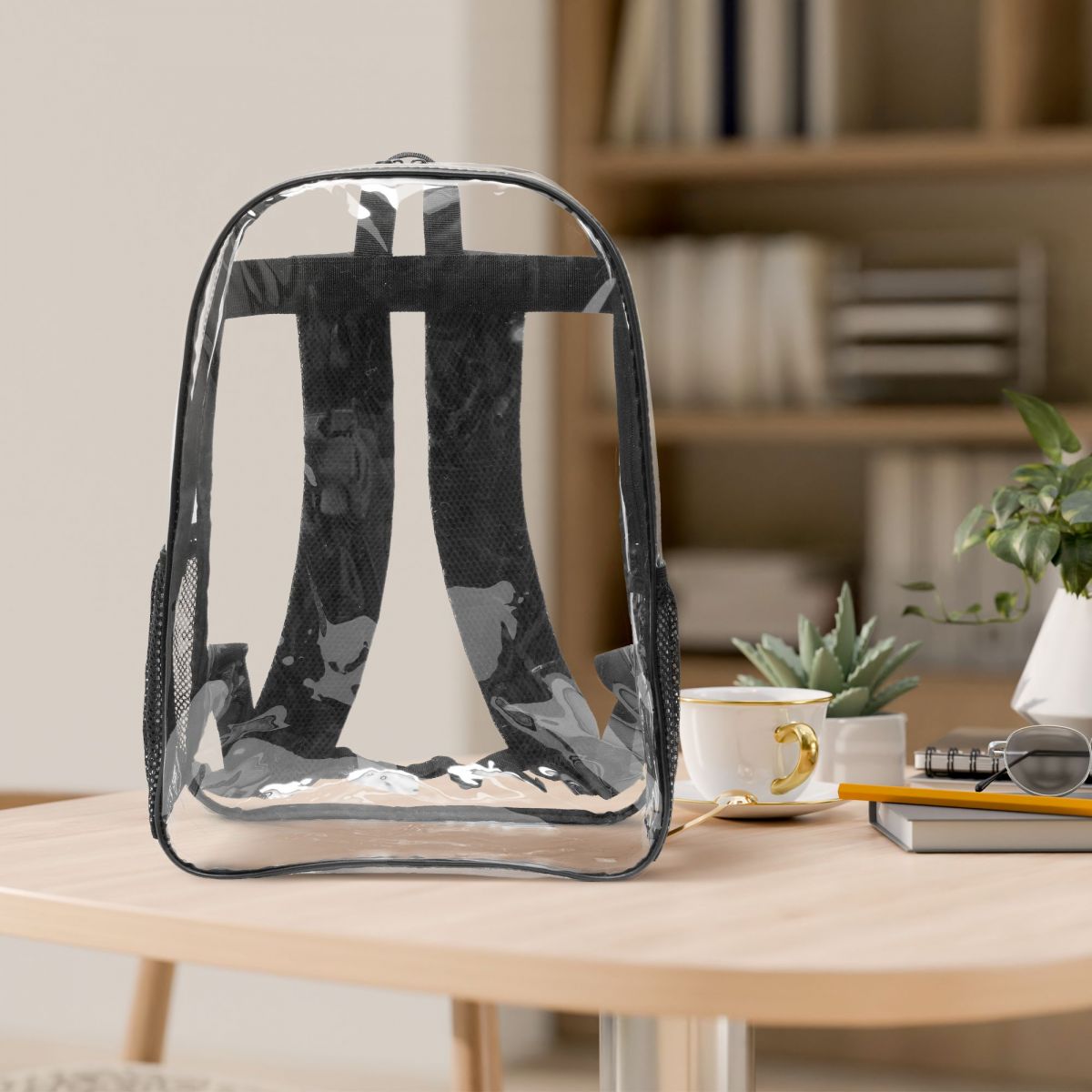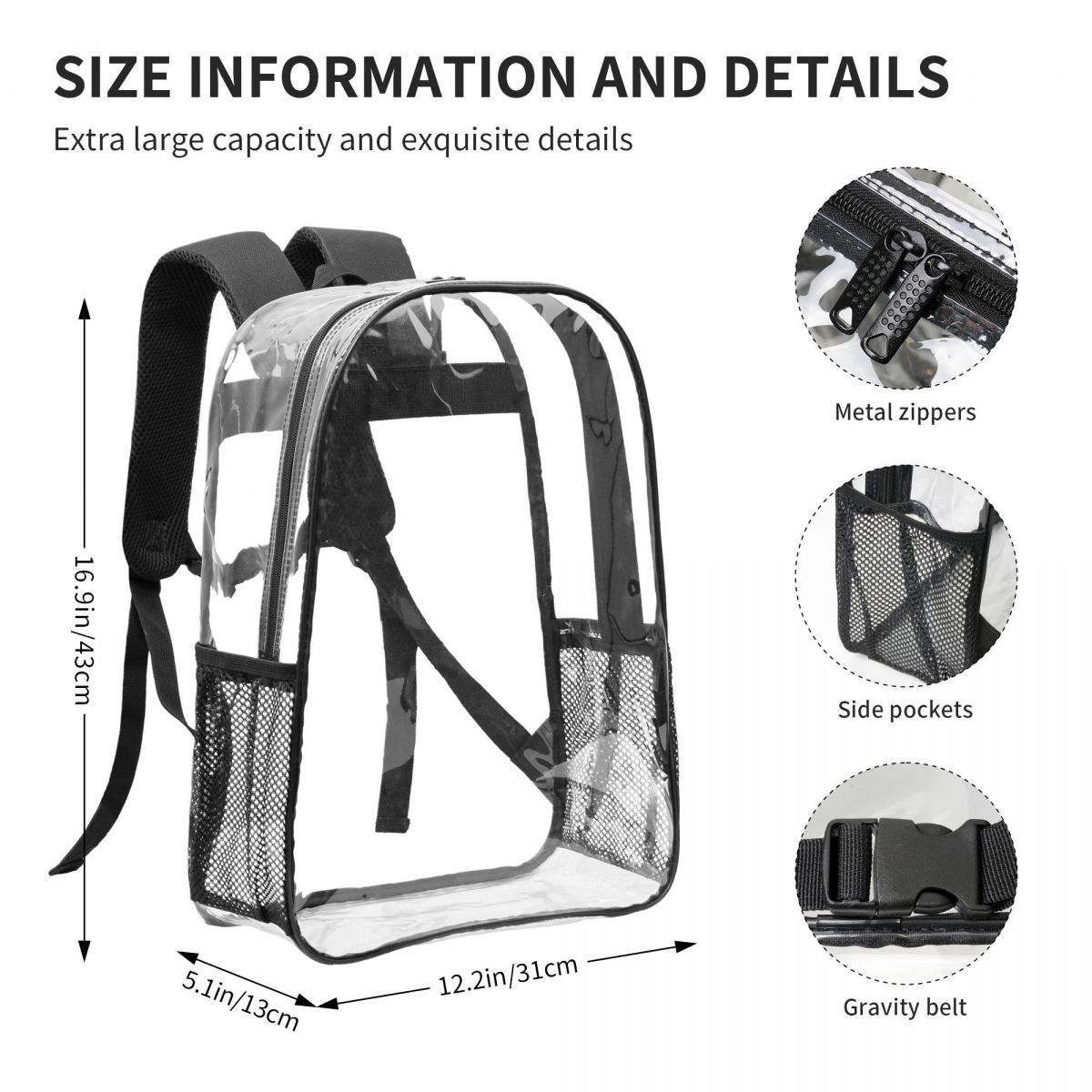 产品性能:这款透明双肩背包采用高品质的透明PVC材质,不仅轻盈耐磨,更具备极佳的透视性,随时轻松查看包内物品,一目了然,取物便捷。背包两侧配备了两个网兜口袋,完美适配水壶、雨伞或是小型折叠伞等出行必备物品,既实用又方便拿取。而背包内里则采用了简约的无口袋设计,提供了一个宽敞而连续的空间,根据个人喜好自由安排物品布局,无论是书籍、笔记本还是日常小物,都能轻松容纳。